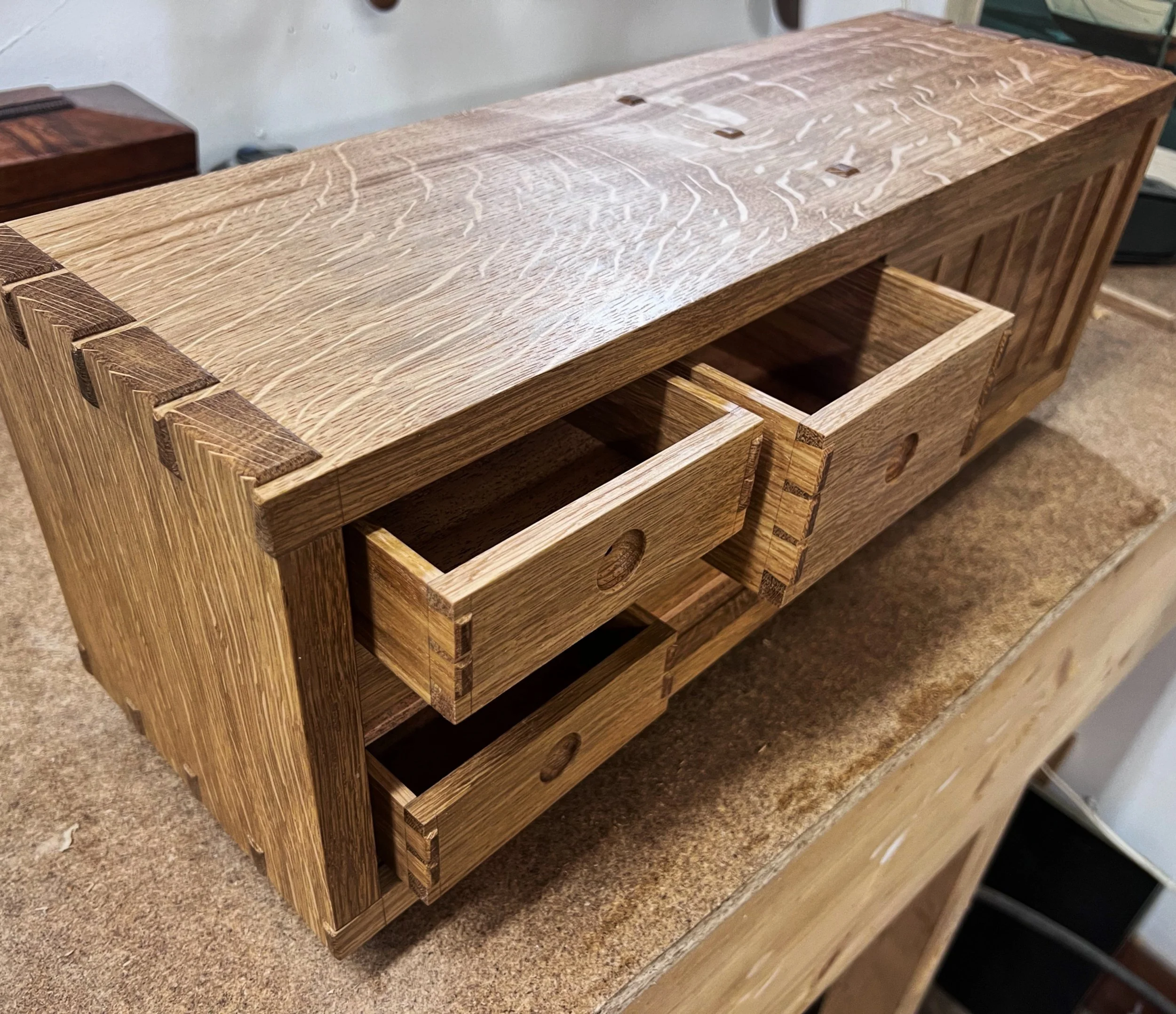 Here she is. 5 little oak drawers housed in a khaya drawer lining, set inside an oak frame with central divider and sliding panelled door. All finished with a clear Osmo oil that makes it incredibly easy to touch up and maintain over the years.