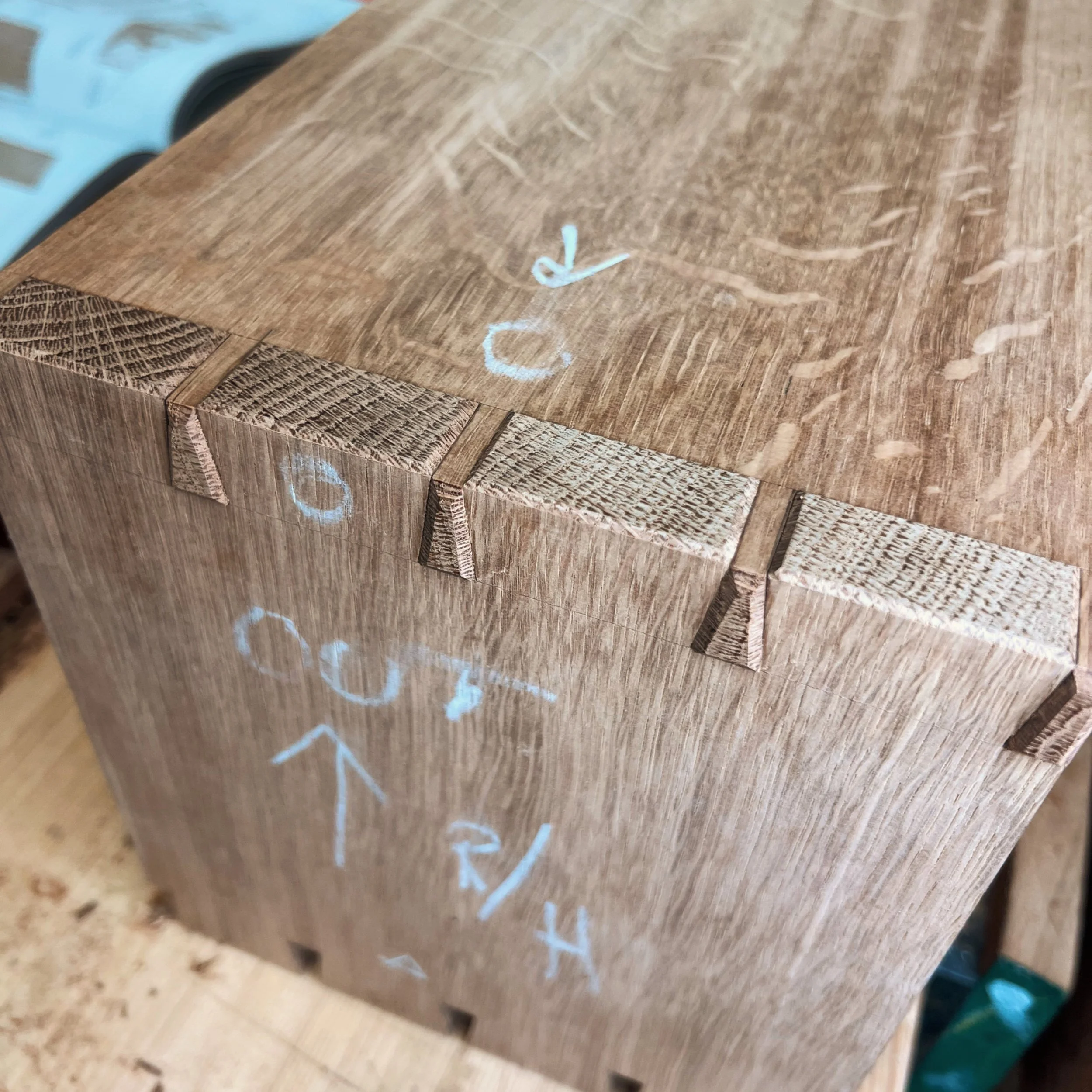 So what better piece to use for a little posh prospective chest, designed by Mike Pekovich over in the states. I admire his approach toward design and woodworking in the he doesn’t shy away from accepting that the Timber will move and joints, particularly flush ones, will show their age very quickly as soon as the humidity changes. Why not then, make joints that ‘don’t finish flush’ so that they will remain proud from new all the way through? His understanding of proportions and weights (as in the relative thicknesses of things) also draws me towards his design. So that’s what I’m doing for now. Practicing my hand dovetailing and just generally making sawdust.