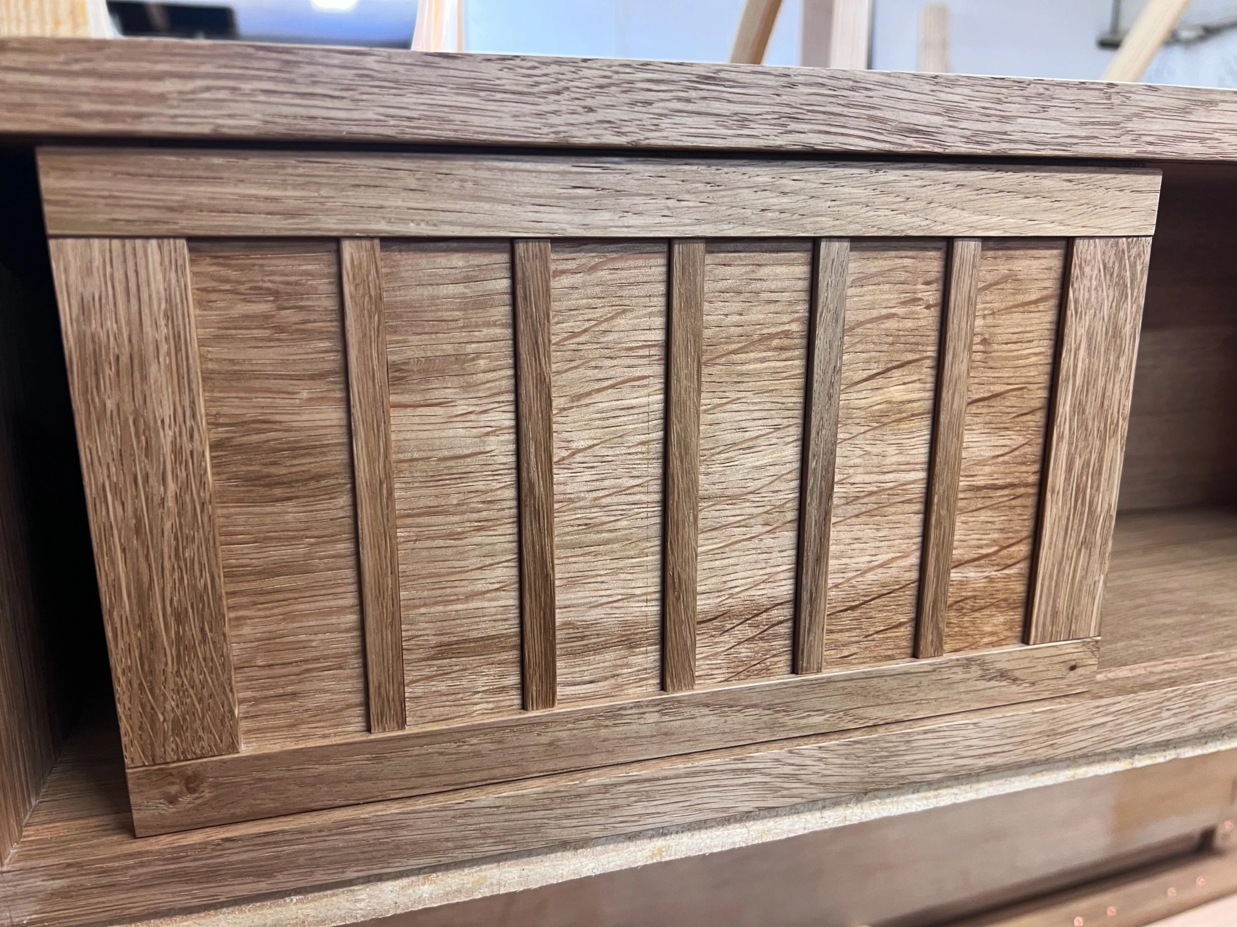 I was really pleased to find so much of the big piece of timber that I started with, so useable and with so much medullary ray visible (meaning the slab was largely quarter sawn). The fleck through the front panel is just a lovely little accent I think. Usually, I’d be using a veneered panel for things as thin as this, I’ve had some bad experiences with thin solid panels warping or busting out of whatever frame I’d tried to contain them within. But this is delicate enough and has enough built in space to move. I think also my ‘making style’ is nowadays more sympathetic to the wood and works better by acknowledging that it’ll move. Only time will tell of course, but I’m pretty confident!